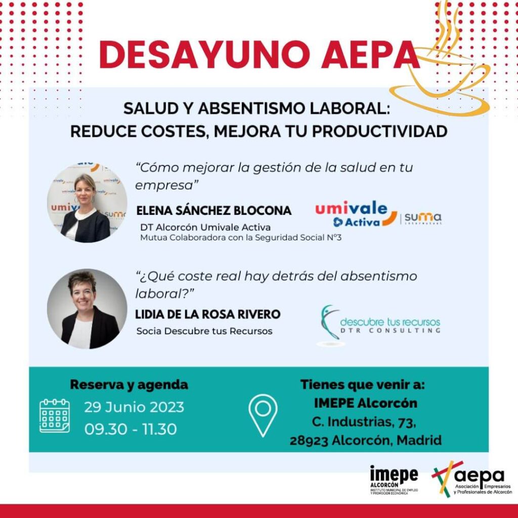 Promovido por la Asociación de Empresarios y Profesionales de Alcorcón (AEPA) y en colaboración con IMEPE, el próximo 29 de junio a las 9:30h, impartido por Umivale Activa, Mutua Colaboradora con la Seguridad Social Nº3, y Descubre Tus Recursos, se realizará el taller “Salud y Absentismo laboral: Reduce costes, mejora tu productividad”. Umivale Activa contará […]