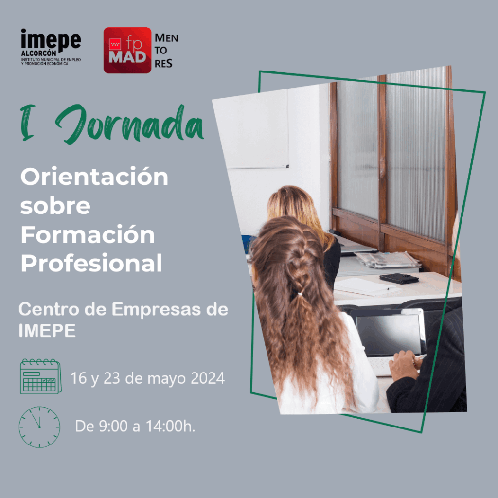 El próximo 16 y 23 de mayo, IMEPE ALCORCÓN, en colaboración con el programa MENTOR de la Consejería de Educación, Ciencia y Universidades de la Comunidad de Madrid, va a celebrar unas Jornadas de orientación sobre Formación Profesional en las que participarán distintos centros educativos de nuestra ciudad y otras entidades.