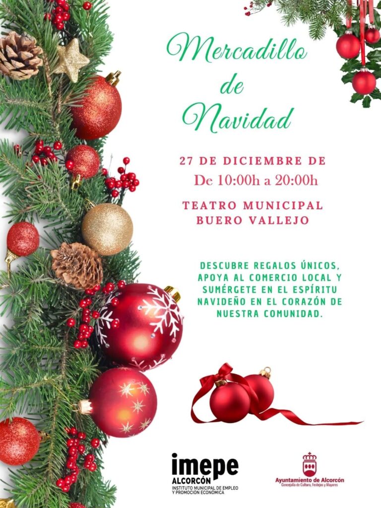 La concejalía de Cultura, Festejos y Mayores del Ayuntamiento de Alcorcón en colaboración con IMEPE ALCORCÓN y asociaciones de comercio, organizan un MERCADILLO DE NAVIDAD dirigido a la participación de establecimientos de comercio de nuestra ciudad y que se situará el próximo 27 de diciembre en el Teatro Municipal Buero Vallejo en horario al público de 10:00 a 20:00h.